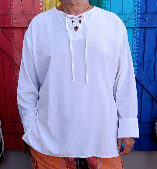 Men's Cotton Hippie Khaddar Lace Up Khurta Long Sleeve Shirt Soft Enzyme Washed
