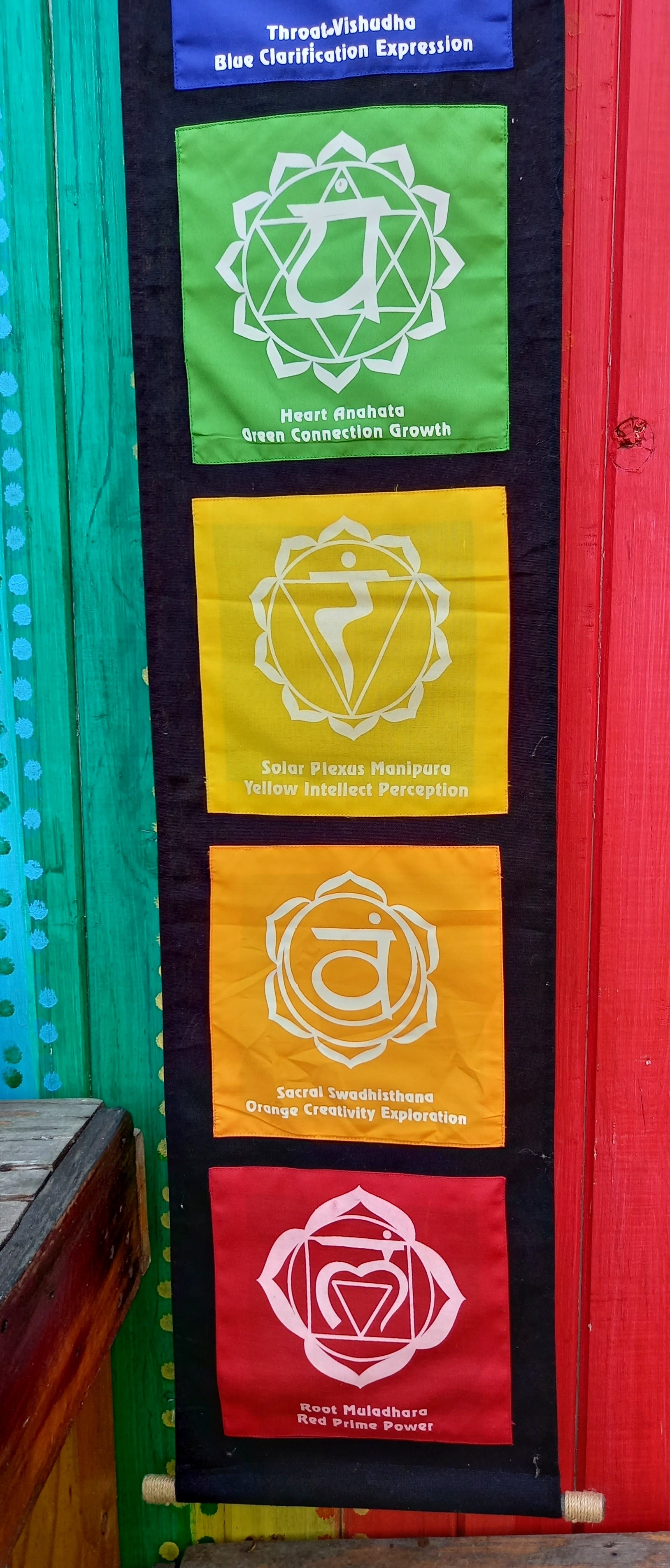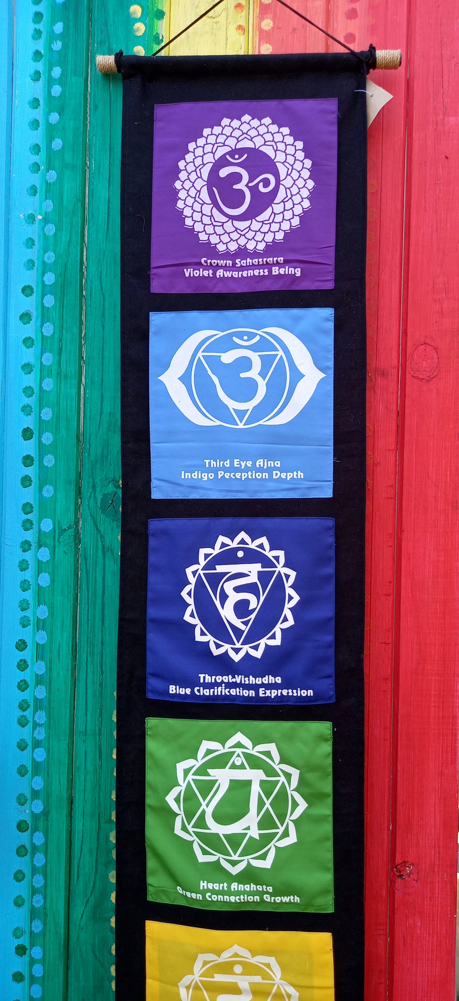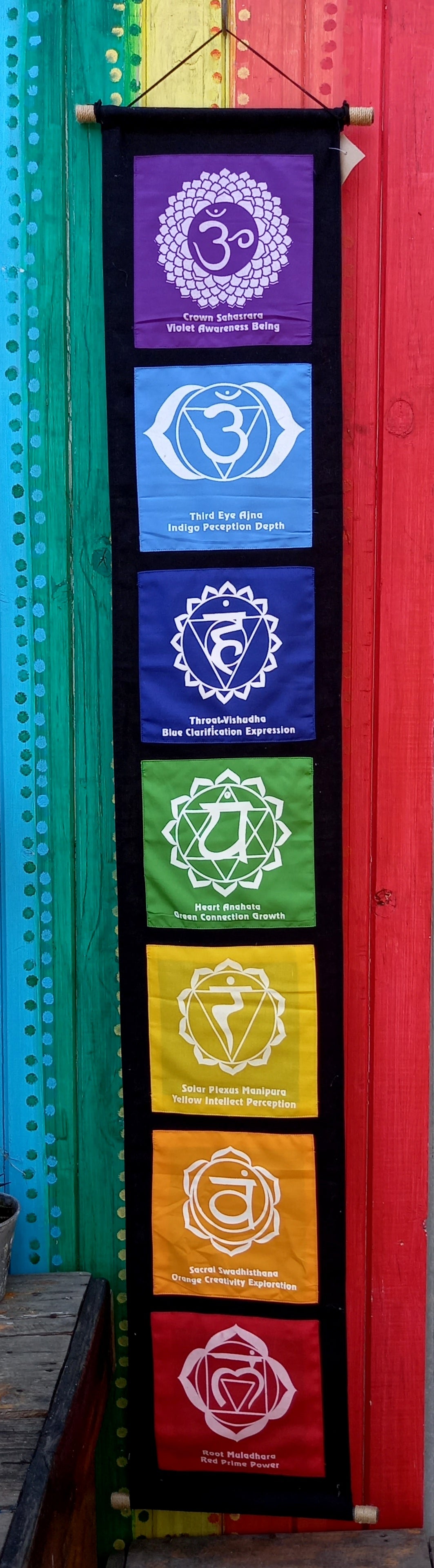 7 Chakra Wall hanging, perfect for your meditation space. Each coloured square has an opening between the black background and the square where you can either store your incense or your crystals for each chakra.
