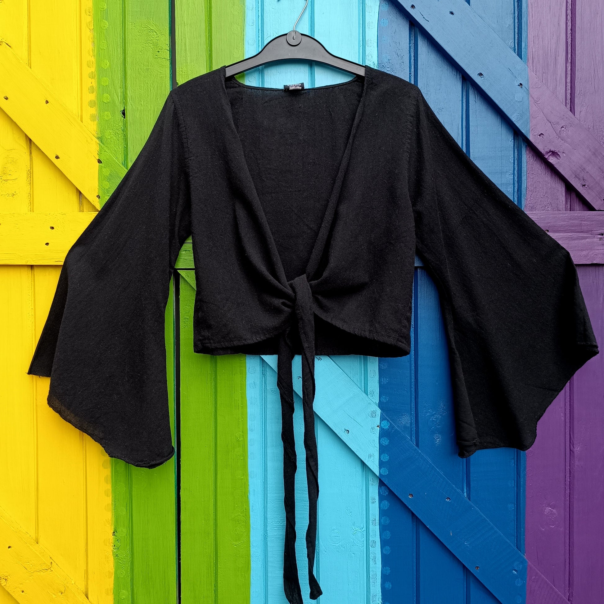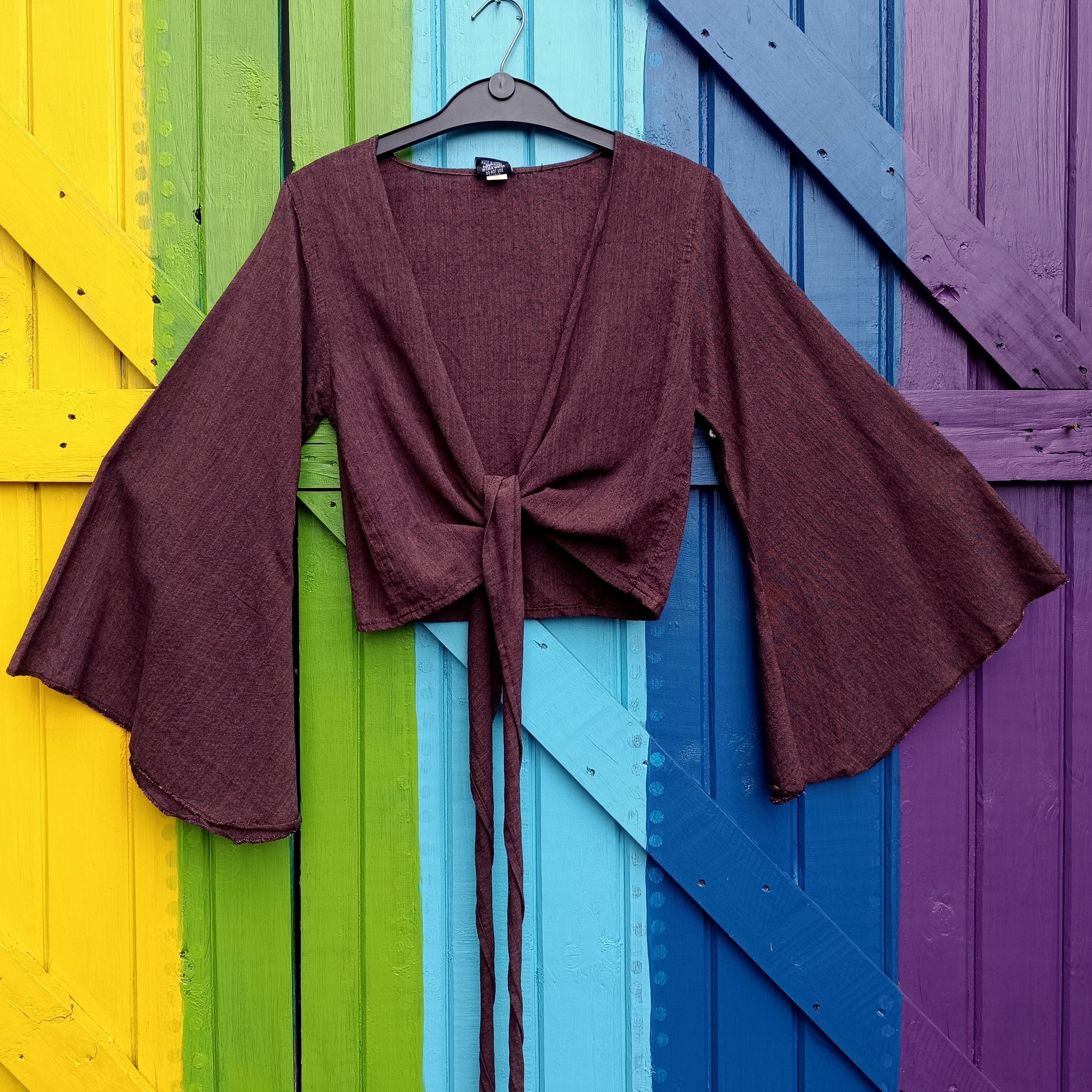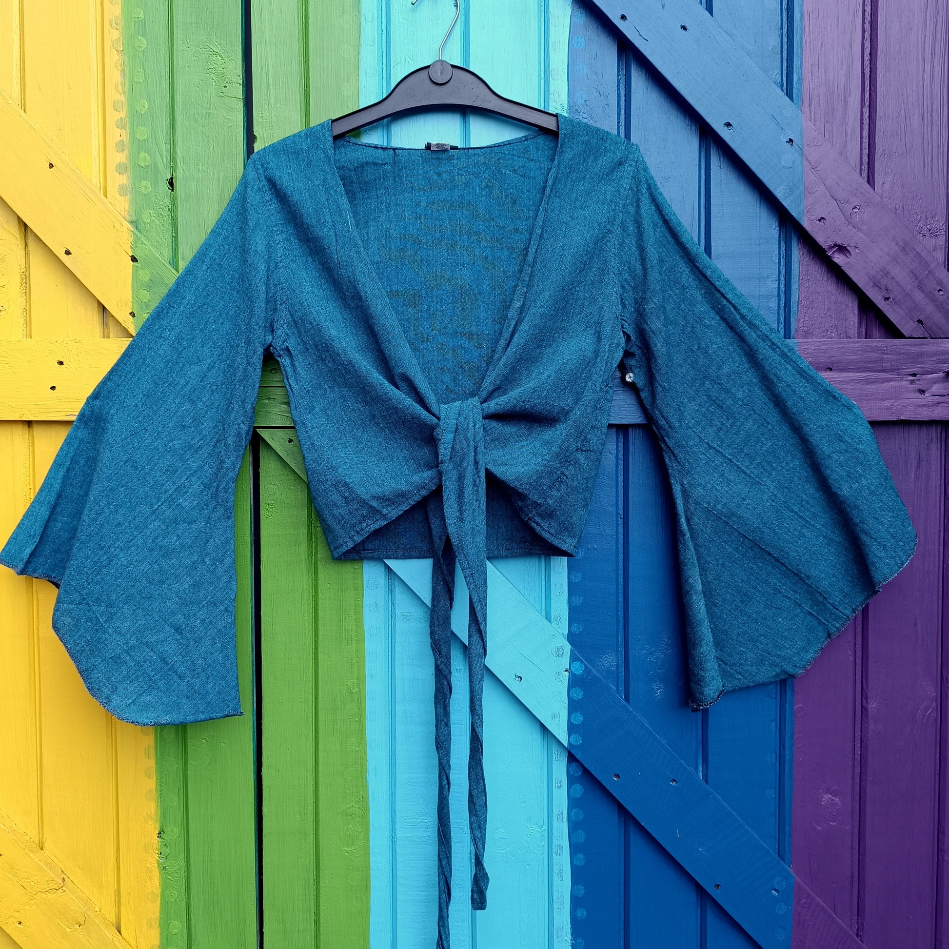 Khaddar Plain Light Weight Cotton Long Sleeve Boho Bell Sleeve Wrap Around Top