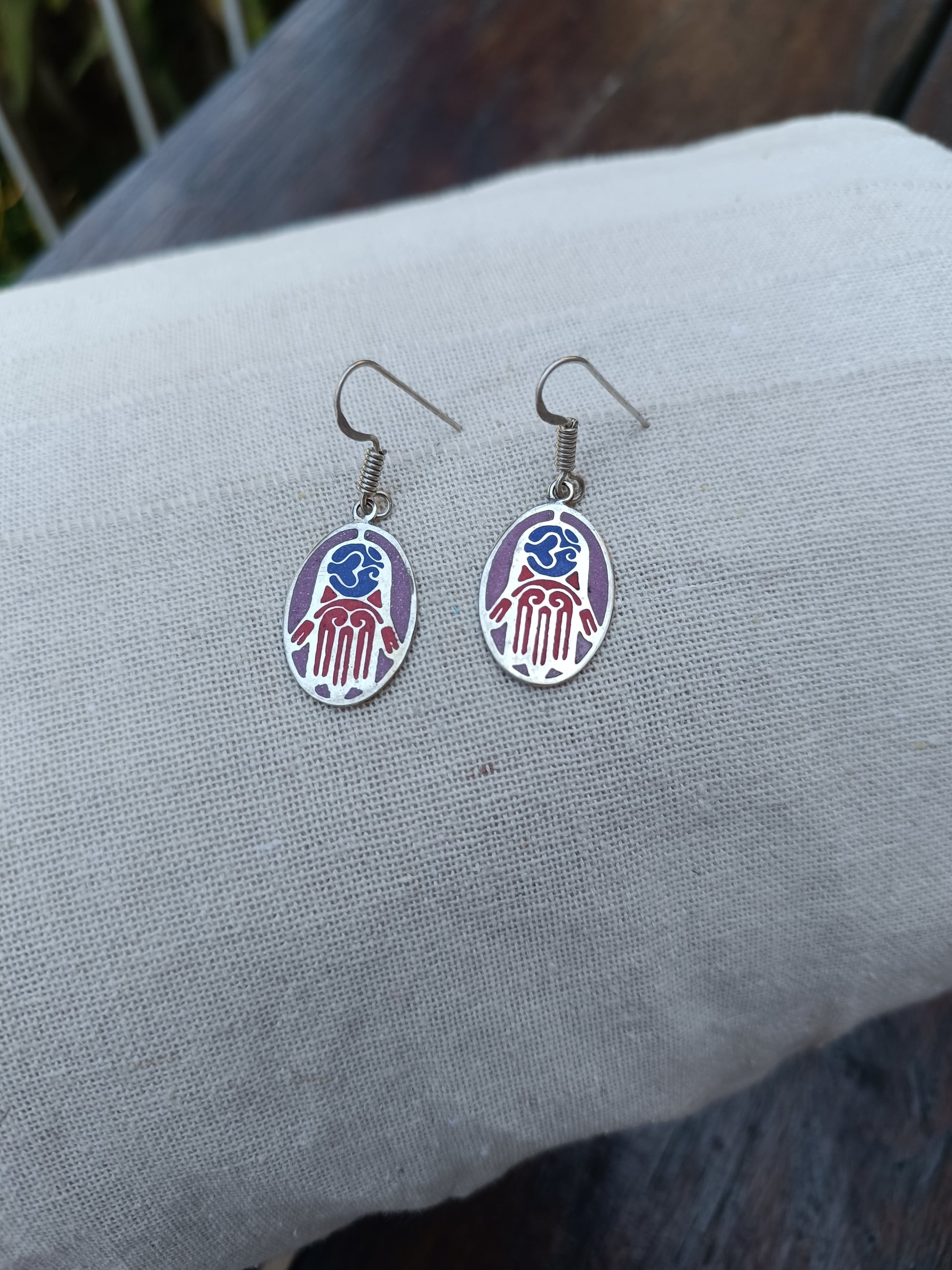 Nepalese Hamsa earrings with red coral and lapiz lazuli inlay on electroplated silver brass base.