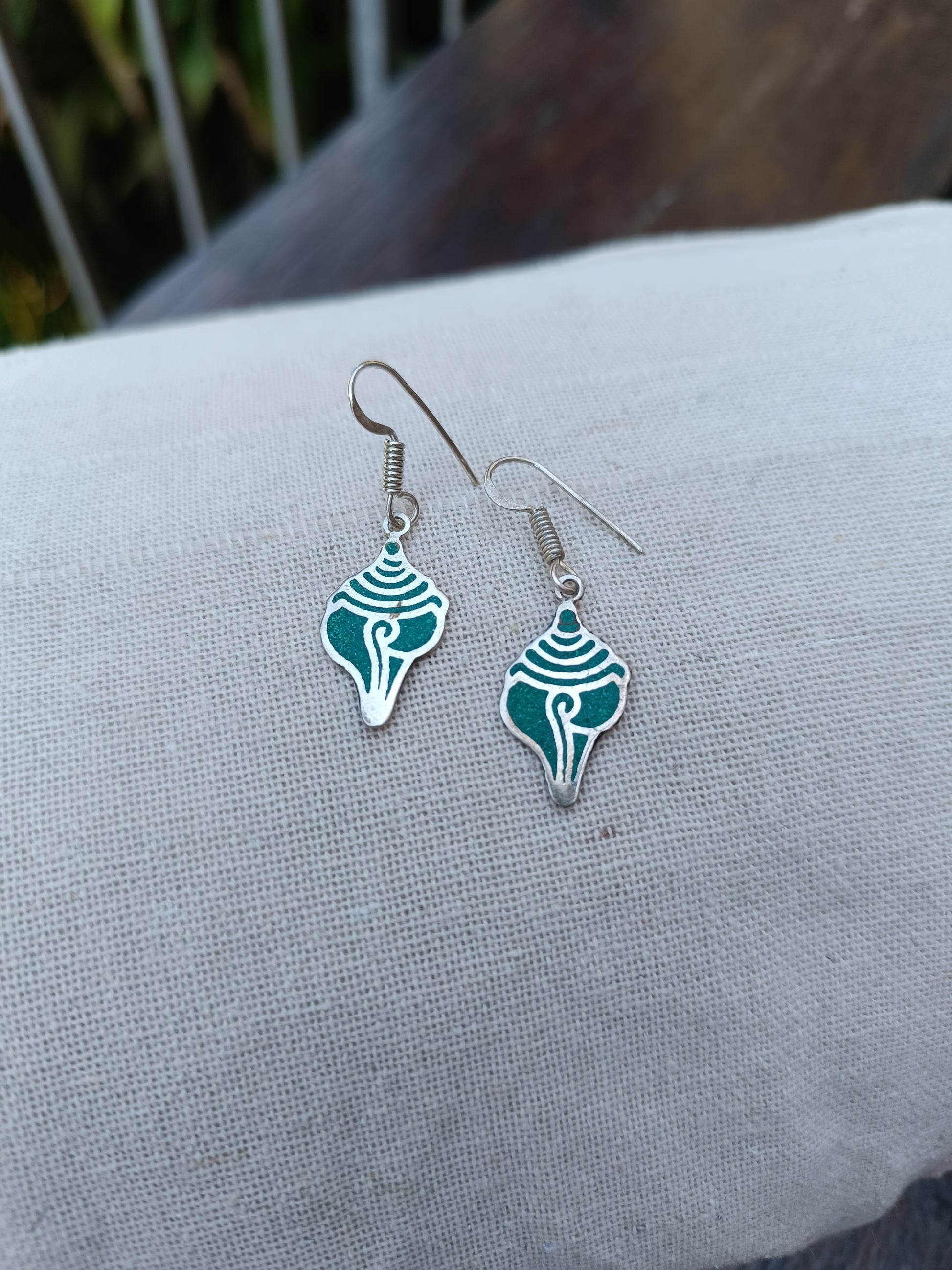 Nepalese Shell earrings with turquoise inlay on electroplated silver brass base.
