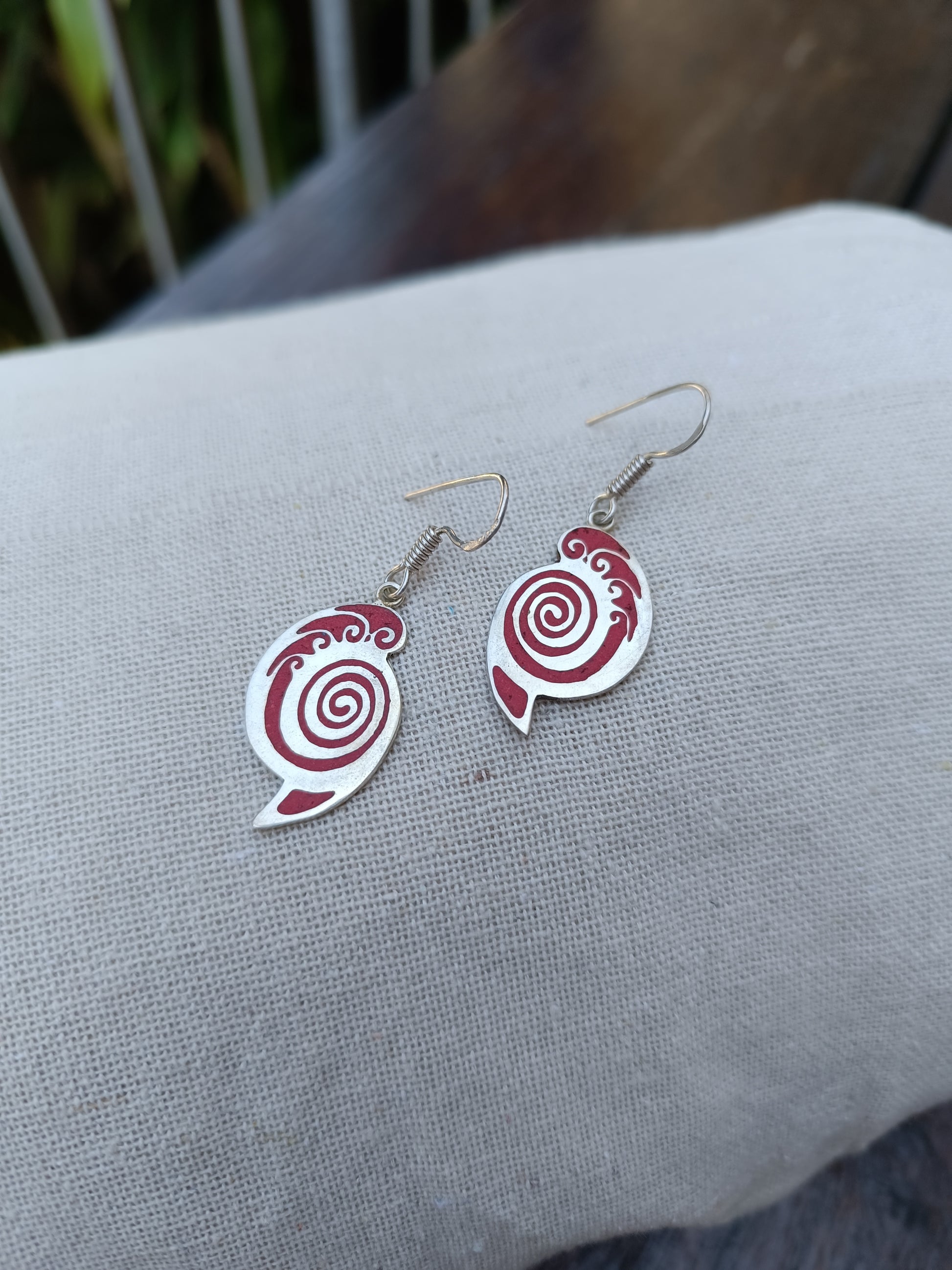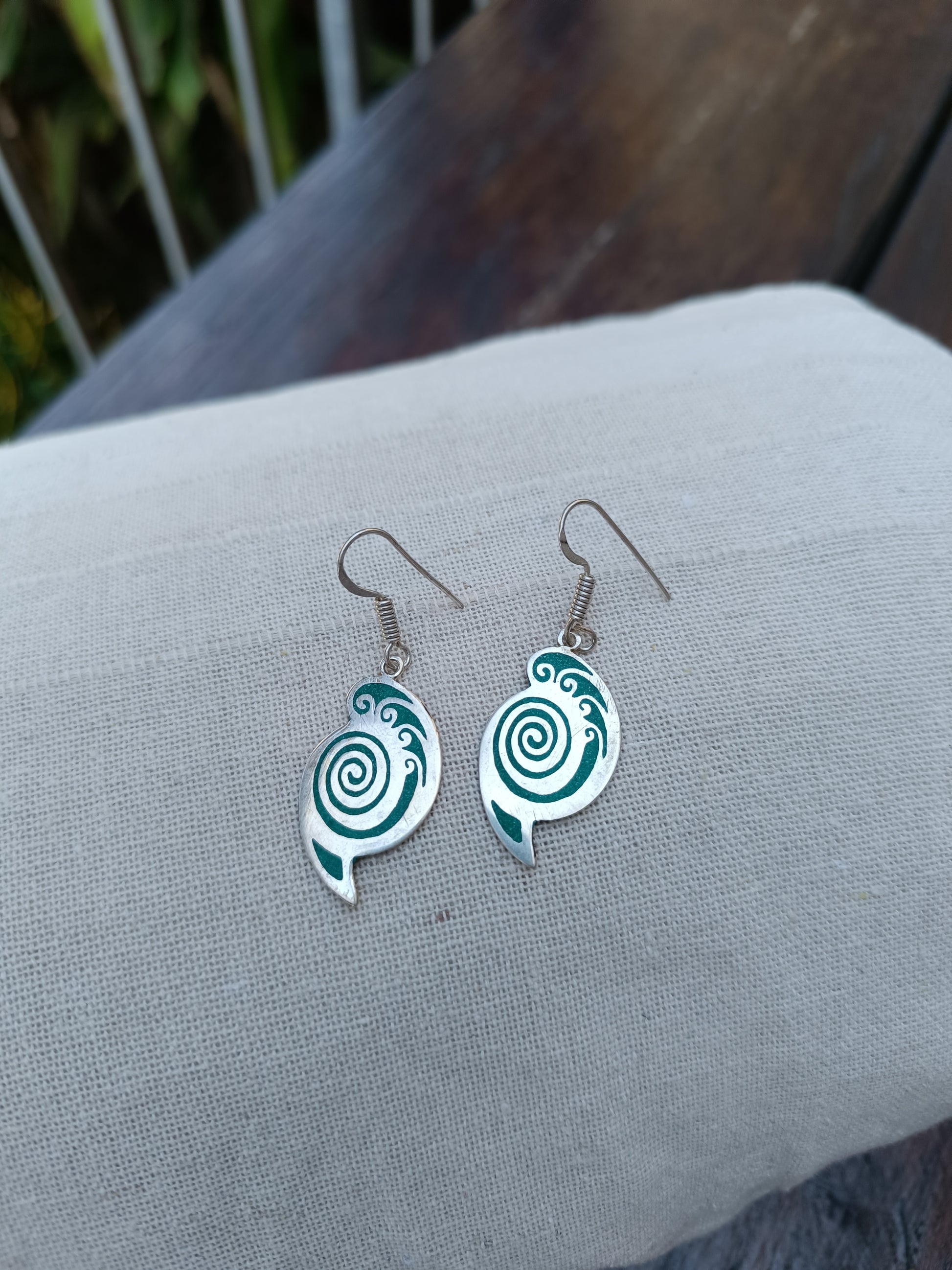 Nepalese Spiral earrings with turquoise inlay on electroplated silver brass base.
