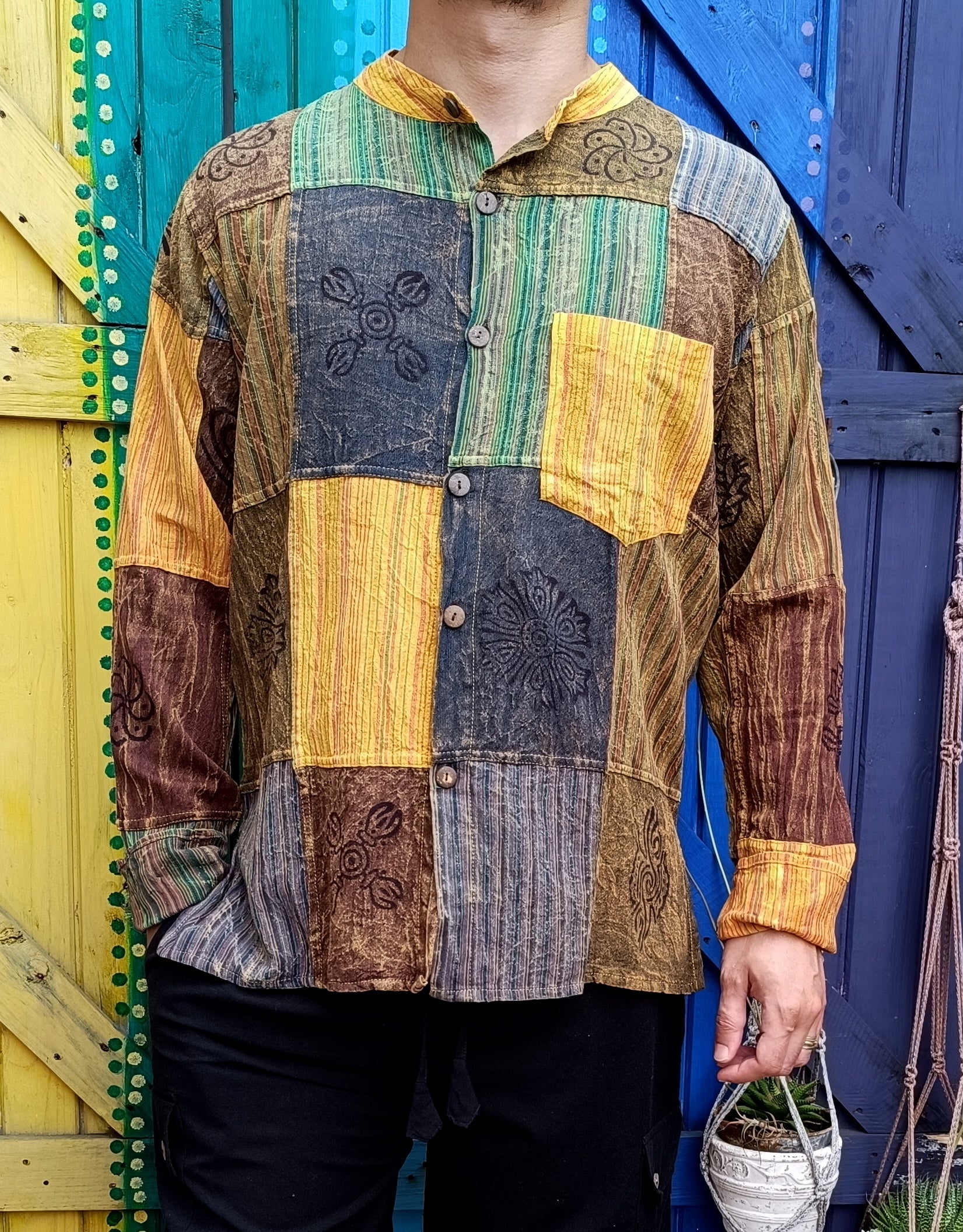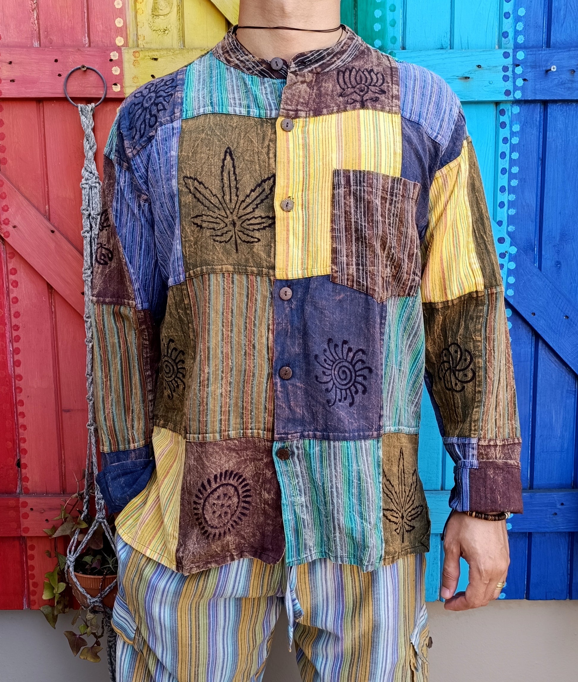 Cotton Hippie Men's Shirts Patchwork Dharke Khaddar Kurta Long Sleeve Shirts